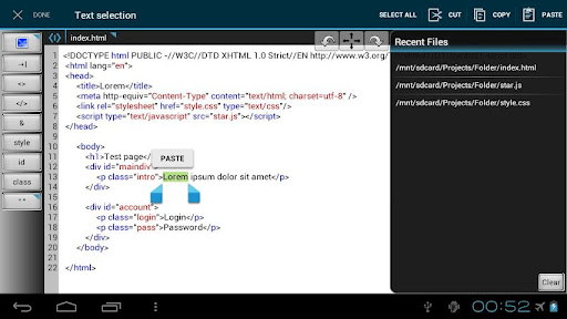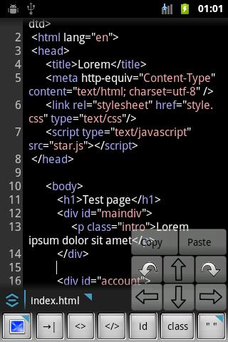 Редактор имеет встроенные виртуальные клавиши для тэгов и популярных ключевых фраз, поддерживает функции undo/redo. Доступны ночной и дневной режим. Идеально подходит для веб-программирования на ходу. Имеющиеся кодировки: ASCII, UTF-8, Win-1252, Win-1250, KOI-8, Win-1251, и др.